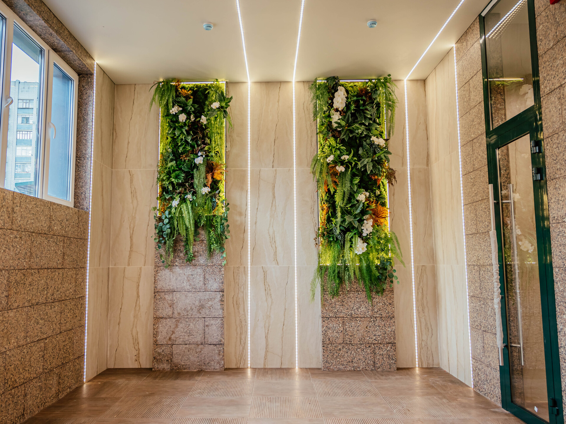 Дизайн стеновых панелей выполнен в классическом стиле и изготовлен из шлифованной нержавеющей стали. Он отличается прочностью и сохраняет свой привлекательный вид на протяжении долгого времени. В кабине лифта установлена ультратонкая панель для вызовов с семисегментным дисплеем, а пол покрыт натуральным гранитным камнем.