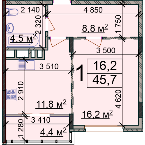 1 -комнатная 45.7 м2 Уточнить стоимость