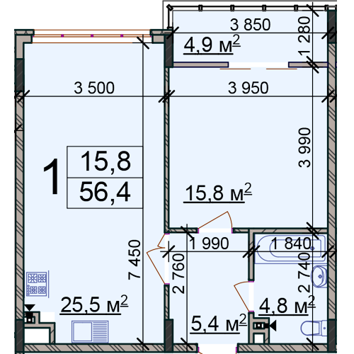 1 -комнатная 45.7 м2 Уточнить стоимость