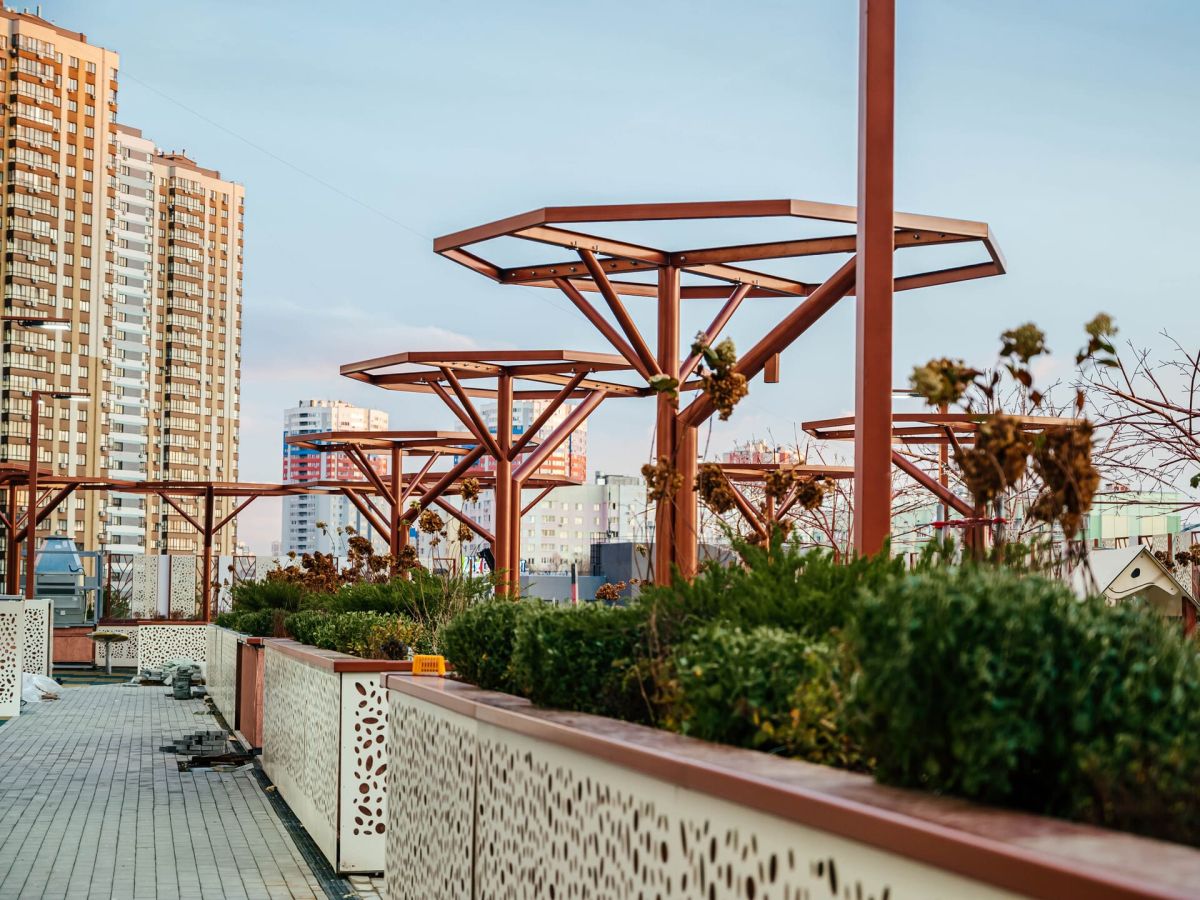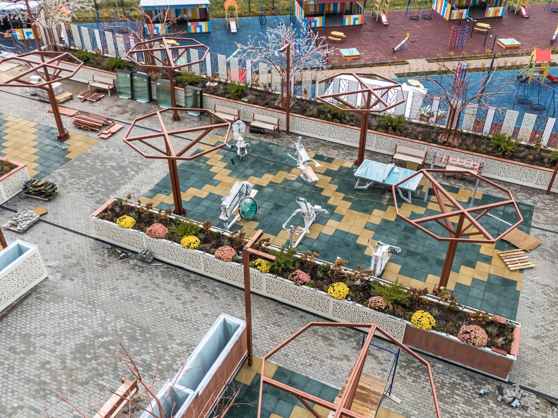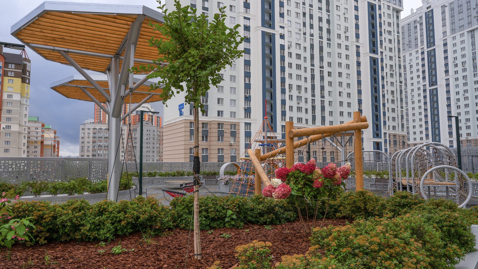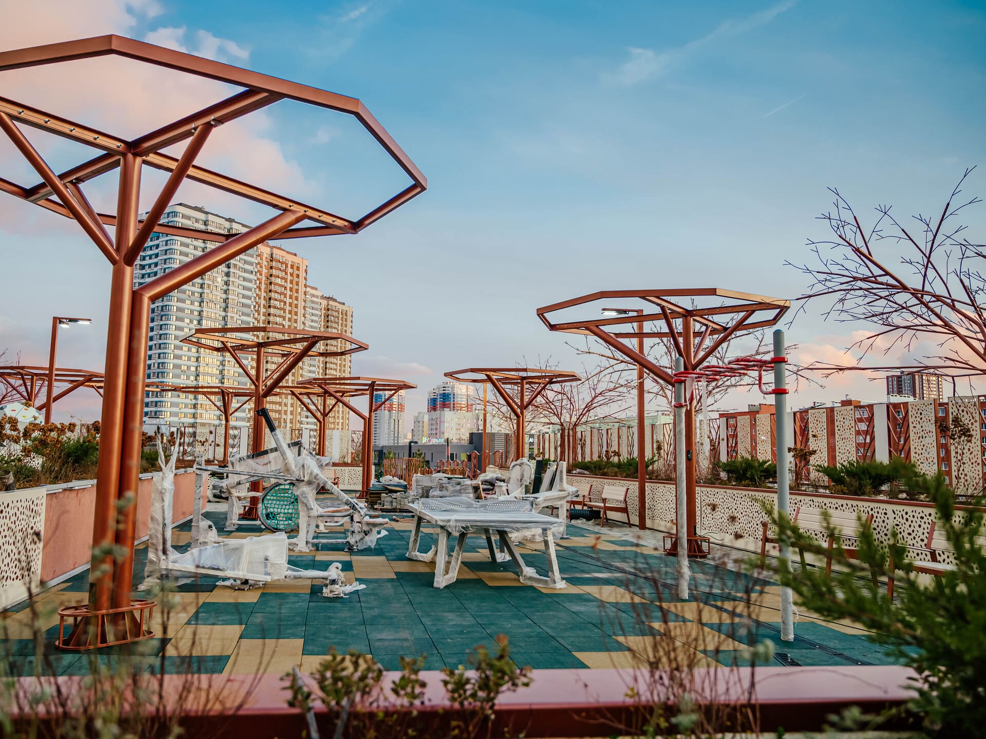 Кроме парково-садовой зоны, созданной ландшафтными дизайнерами, здесь спроектированы площадки для разных активностей. Дети, взрослые и пожилые люди могут отдыхать, не мешая друг другу, играть, общаться и работать прямо на свежем воздухе.