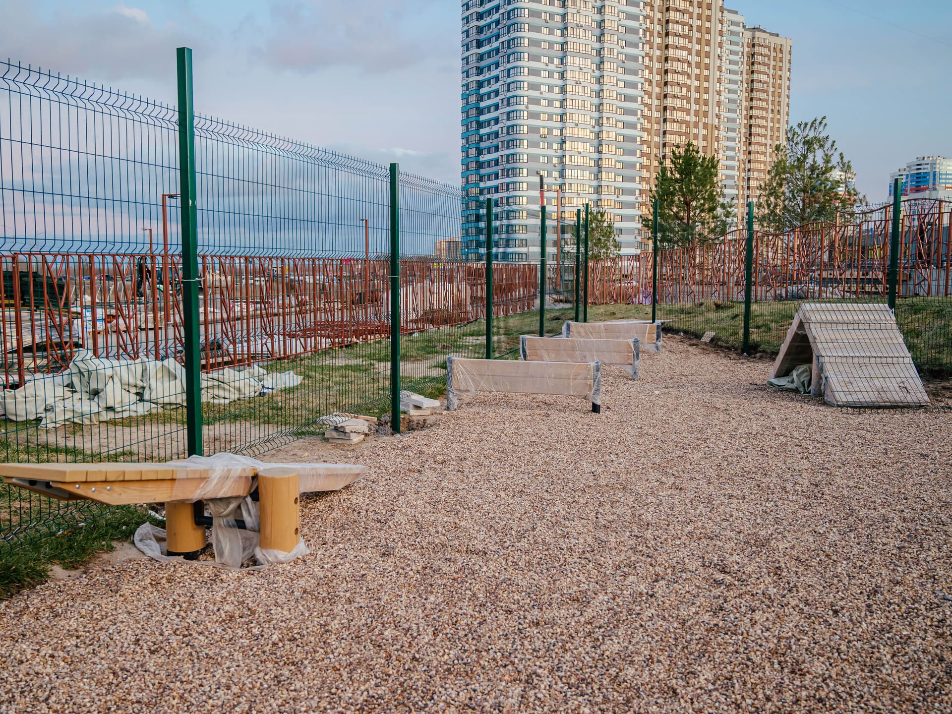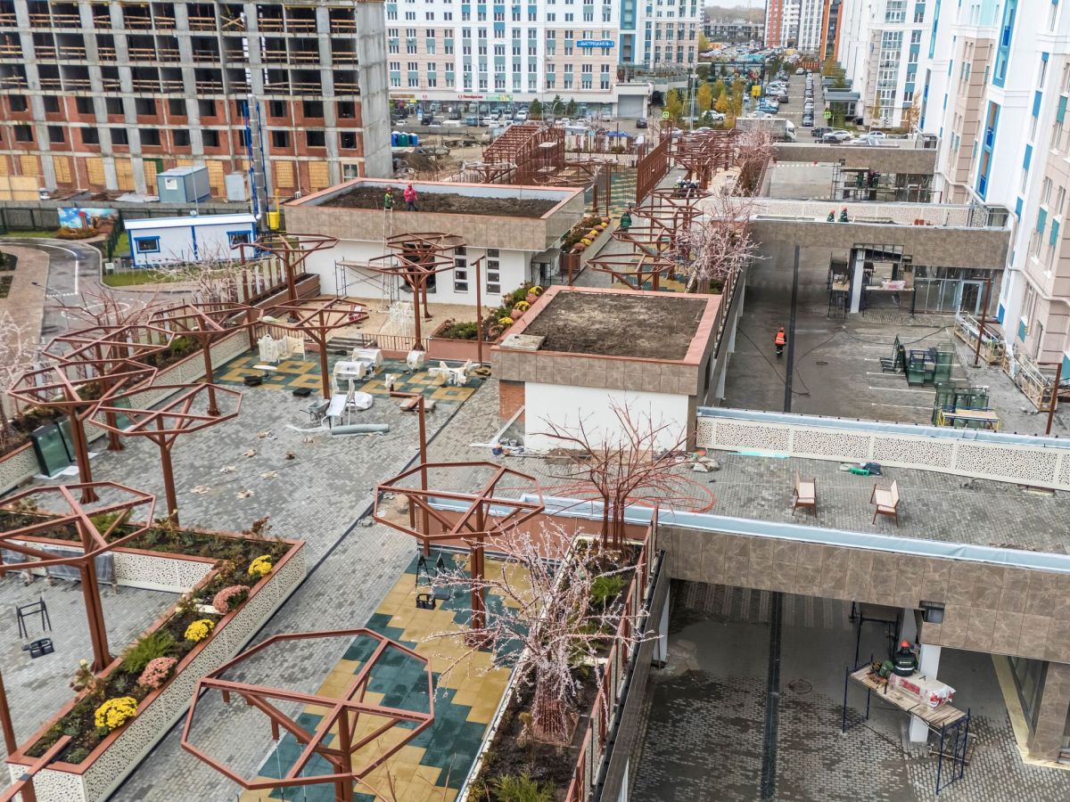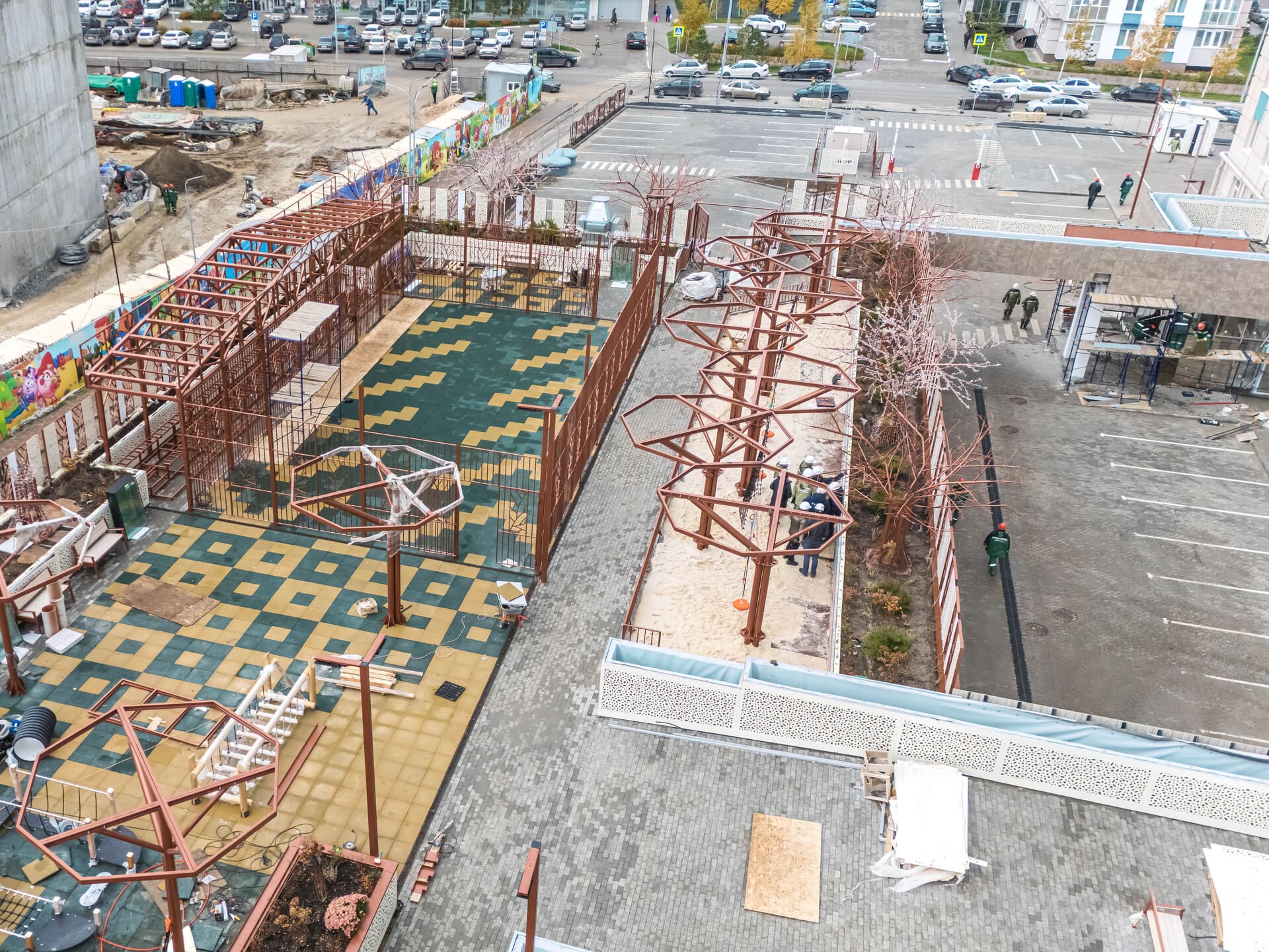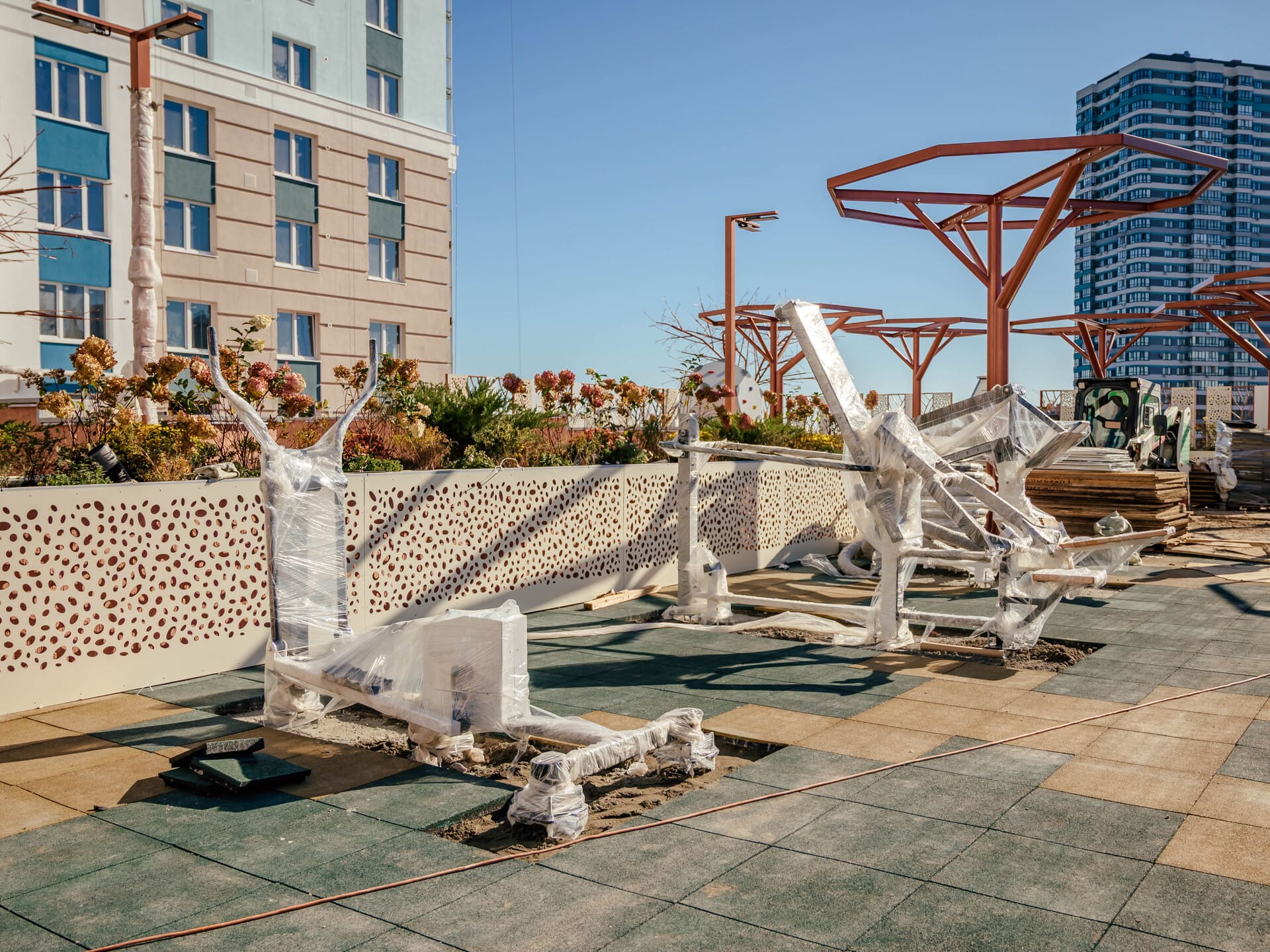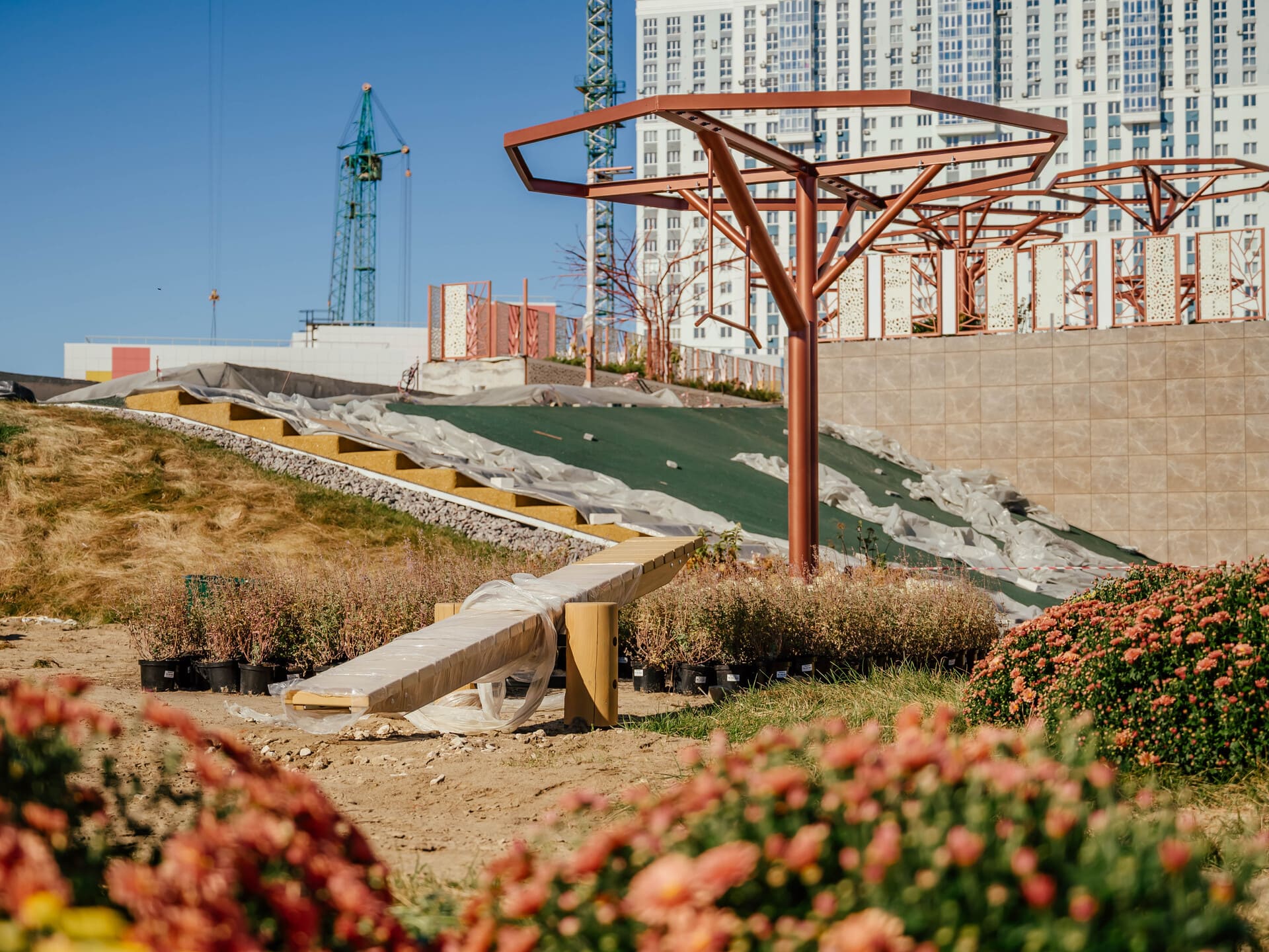 Кроме парково-садовой зоны, созданной ландшафтными дизайнерами, здесь спроектированы площадки для разных активностей. Дети, взрослые и пожилые люди могут отдыхать, не мешая друг другу, играть, общаться и работать прямо на свежем воздухе.