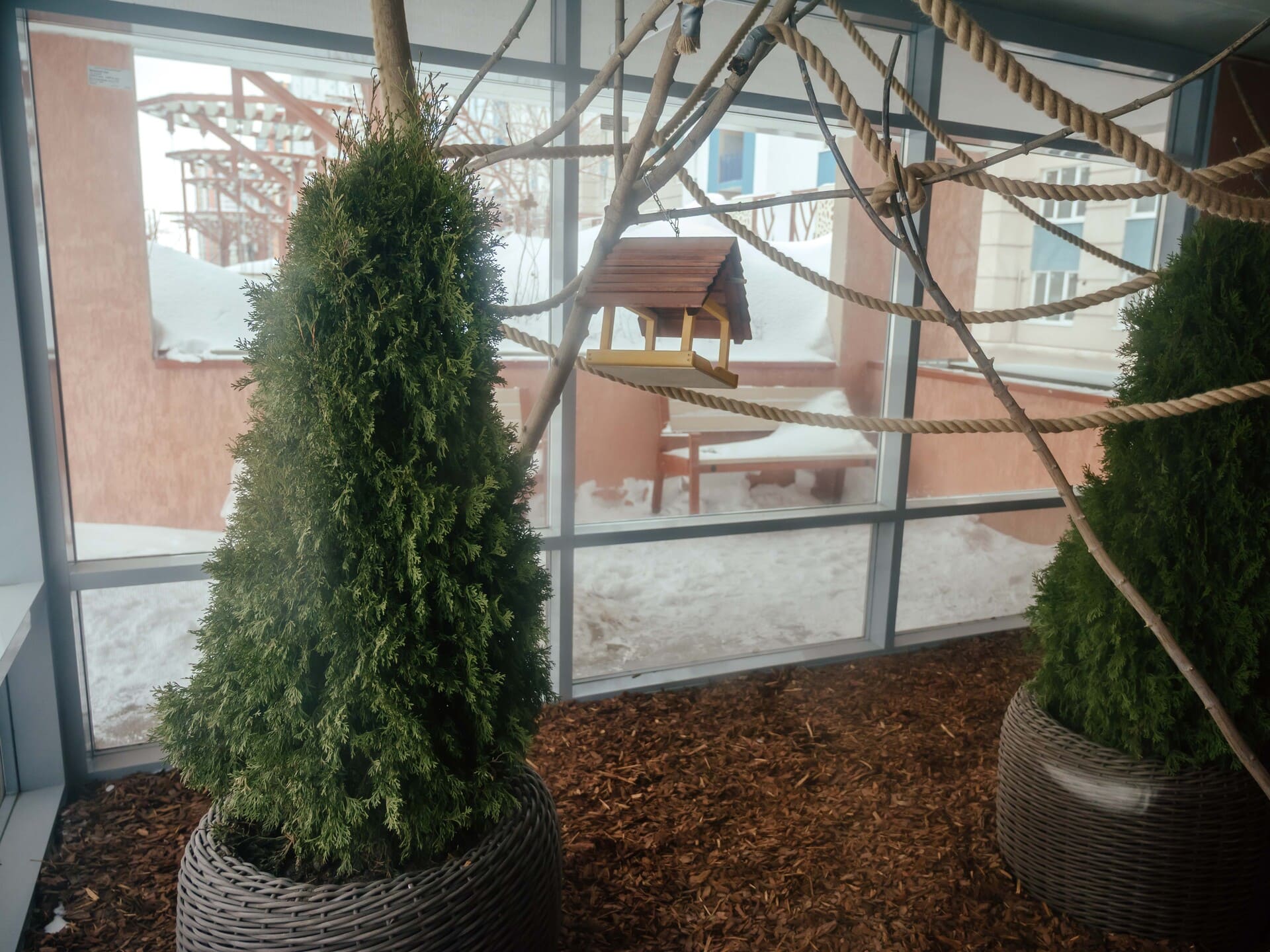 На придомовой территории ЖК обустроена большая клетка для семьи белочек. Они заселились в новый дом примерно два года назад, за ними на постоянной основе ухаживают сотрудники УК «Зелёный сад - Мой дом».