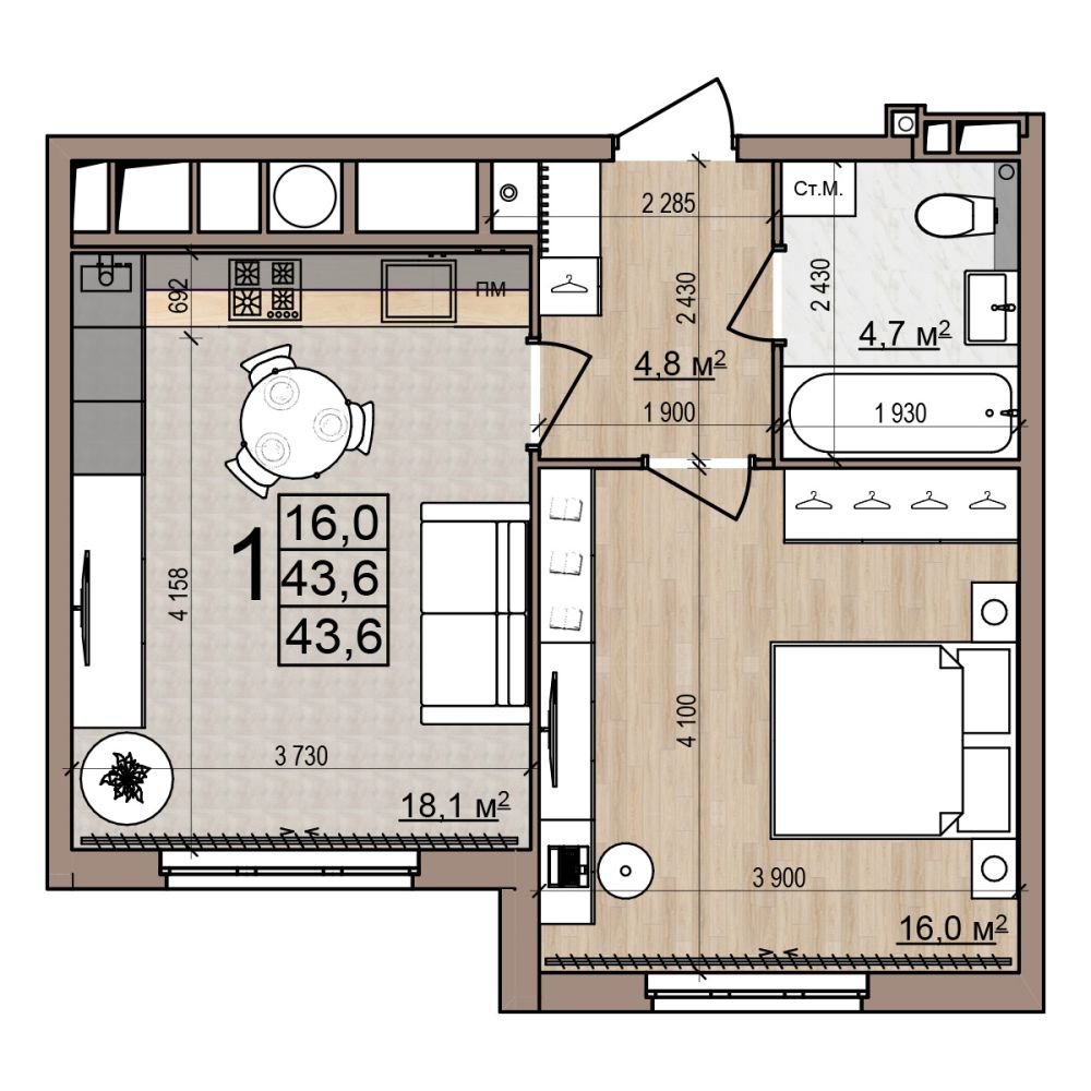 1 -комнатная 43.6 м2 5 755 200 ₽