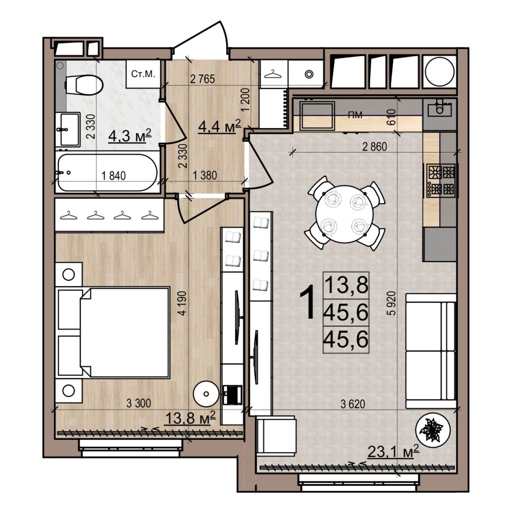 1 -комнатная 45.6 м2 6 110 400 ₽