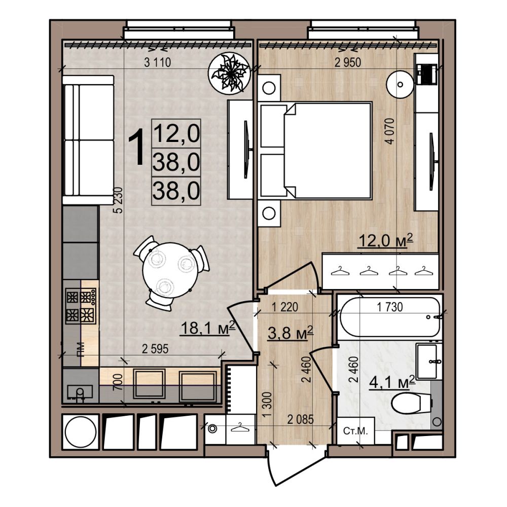 1 -комнатная 38 м2 5 776 000 ₽