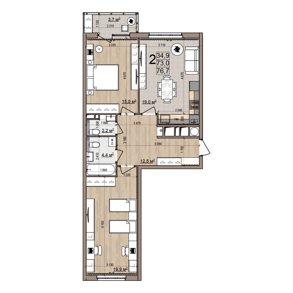 Квартира 2-комнатная 76.7 м2