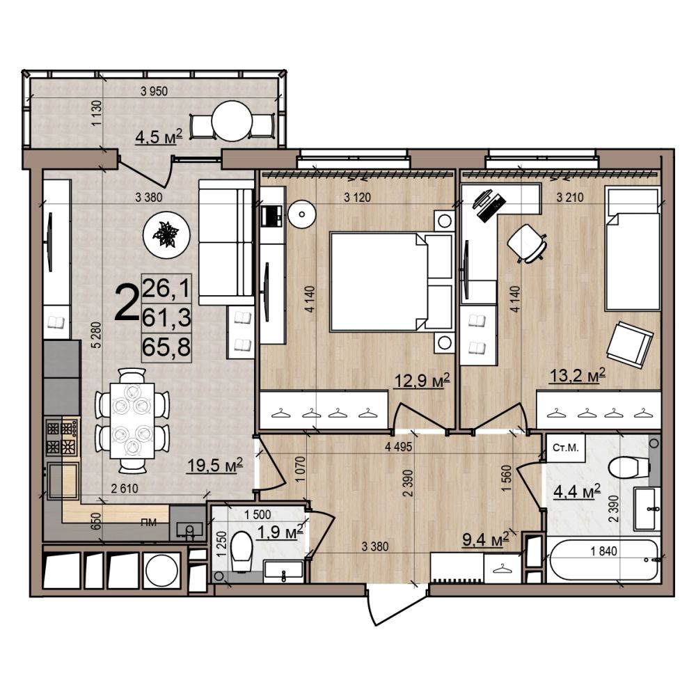 2 -комнатная 65.6 м2 8 396 800 ₽