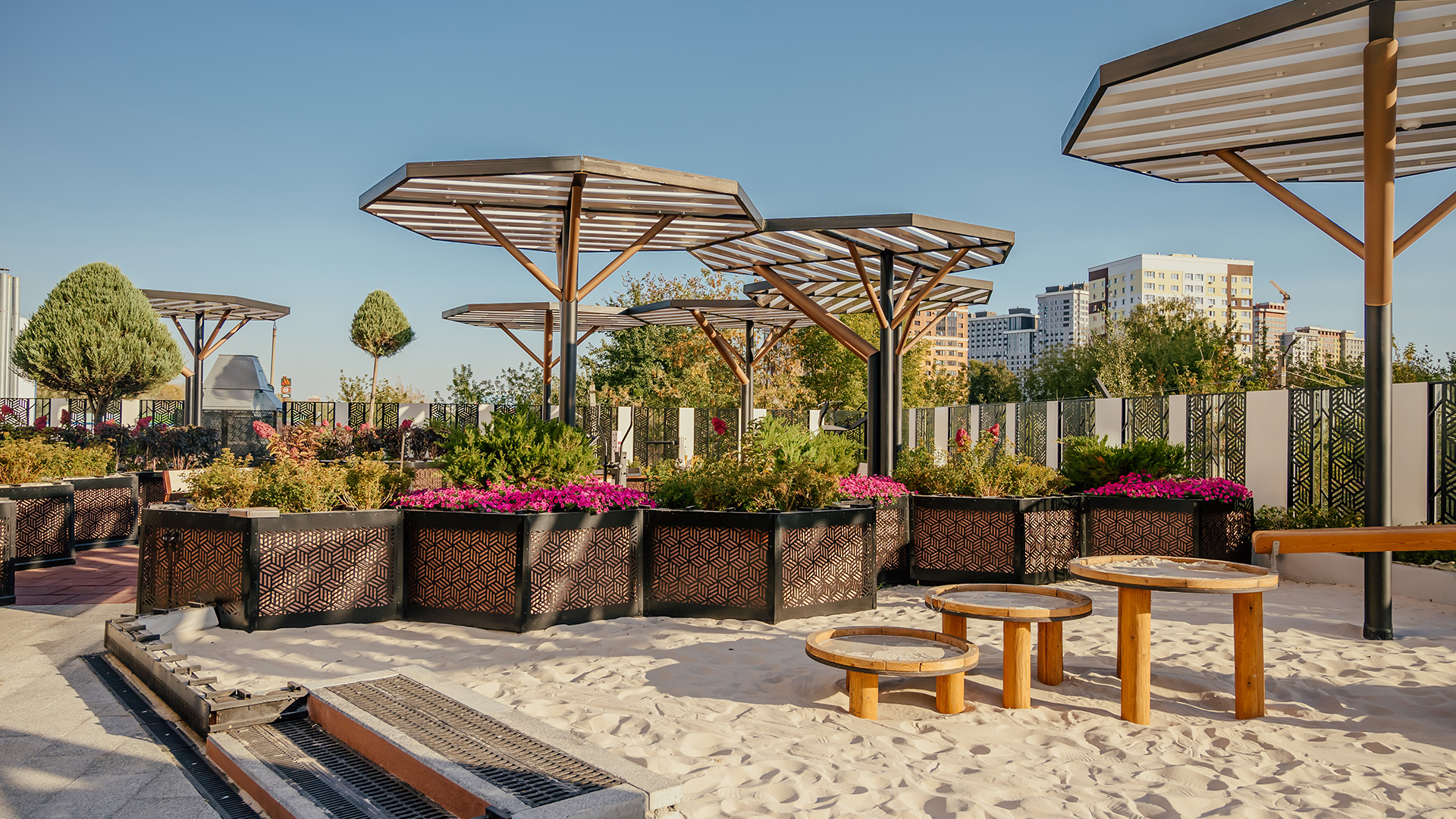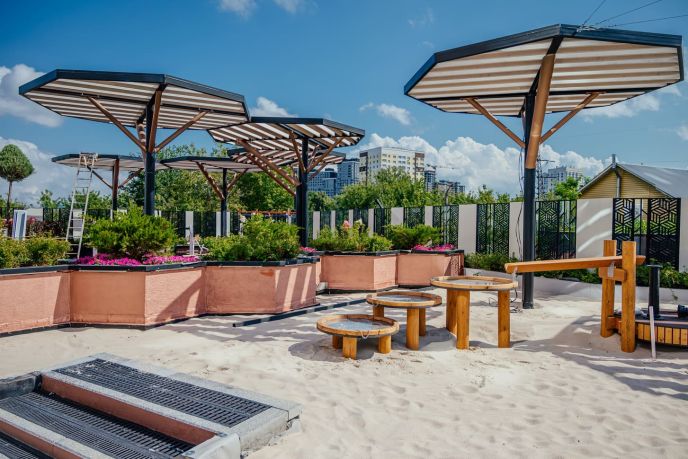 Наша площадка способствует погружению мальчишек и девчонок в естественную среду, свободную от информационного шума, побуждает к экспериментам, изучению мира и игре. А мамы с малышами в колясках оценят лаунж-зоны в окружении зелени, где можно отдохнуть.