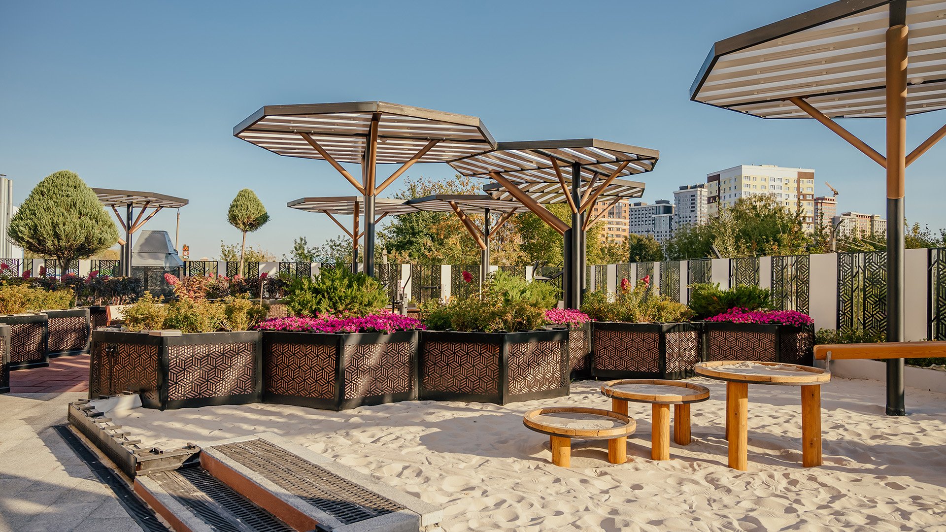Детская площадка занимает центральное место на стилобате жилого комплекса. На ней установлено современное водно-игровое оборудование, которое понравится детям разных возрастов. Покрытие площадки изготовлено из травмобезопасных материалов, что оберегает малышей от ушибов при непредвиденных падениях. В песочнице - чистейший кварцевый песок, который регулярно обновляется.