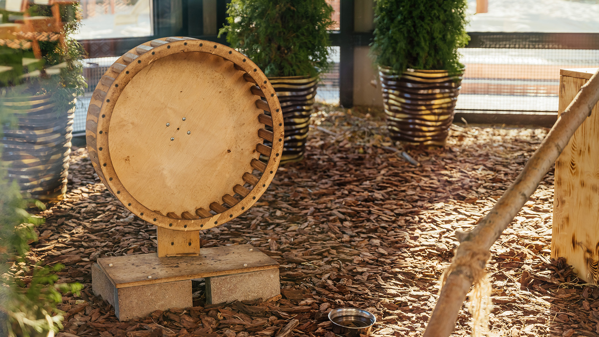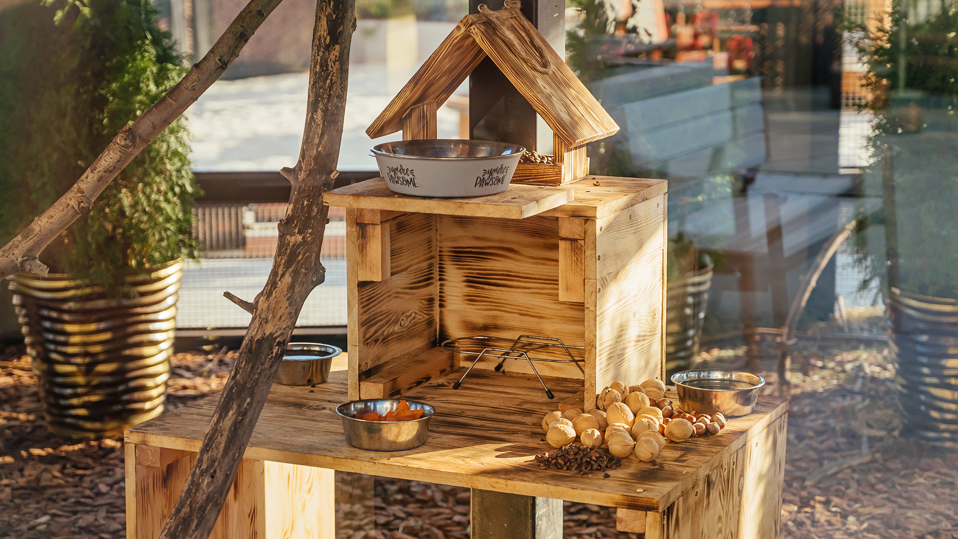 Жильцы дома могут наблюдать за шустрыми зверьками и подкармливать их. О том, чем можно и чем нельзя кормить белок, написано на специальной табличке, прикреплённой к стенке бельчатника.