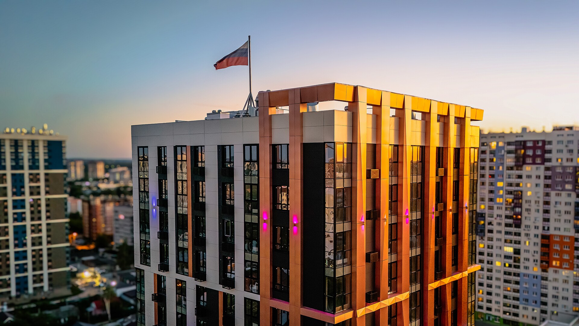 Одной из главных особенностей проекта являются угловые панорамные окна, которые визуально расширяют пространство, делая его светлее и воздушнее. Вид из квартиры становится поистине впечатляющим, особенно на восходе и закате.