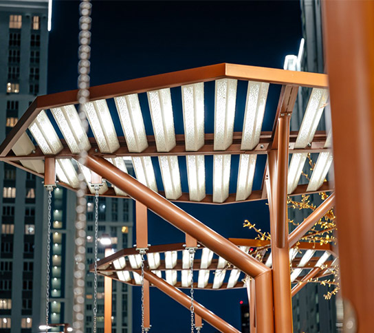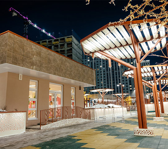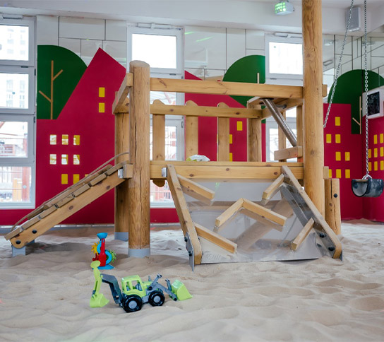 Уникальная разработка компании – всесезонная песочница с адаптивным микроклиматом. В крытом помещении поддерживается комфортная температура около +20°C, дополнительные опции — зона скалодрома и кинопроектор. Здесь есть горки и лазалки, водно-игровое оборудование, а под потолком переливаются разноцветные диско-шары. На большом экране показывают мультфильмы, превращая обычную прогулку в настоящий праздник для детей.