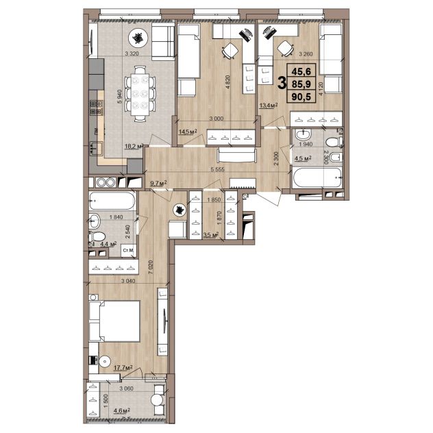 3 -комнатная 90.5 м2 Уточнить стоимость