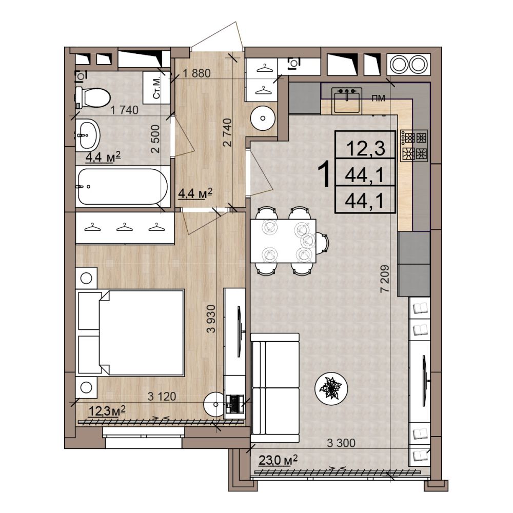 Квартира 1-комнатная 44.1 м2