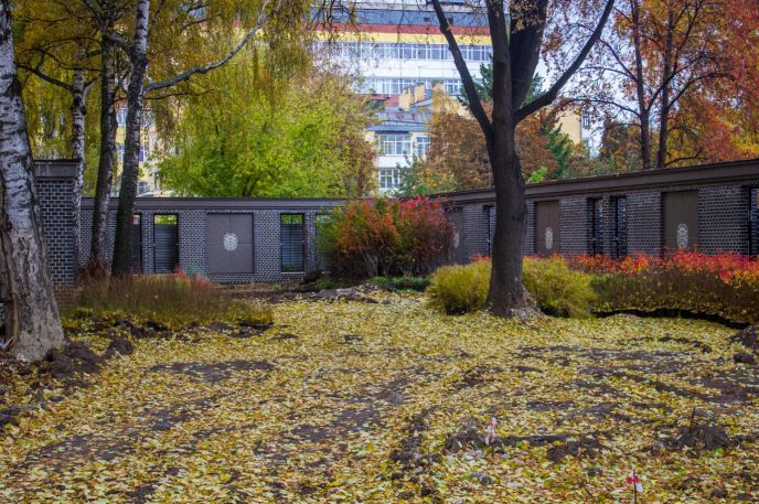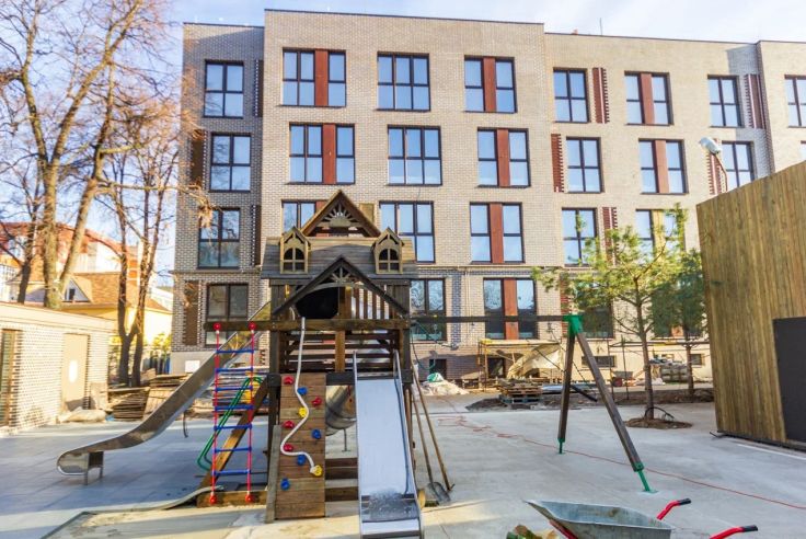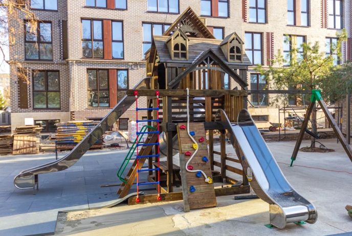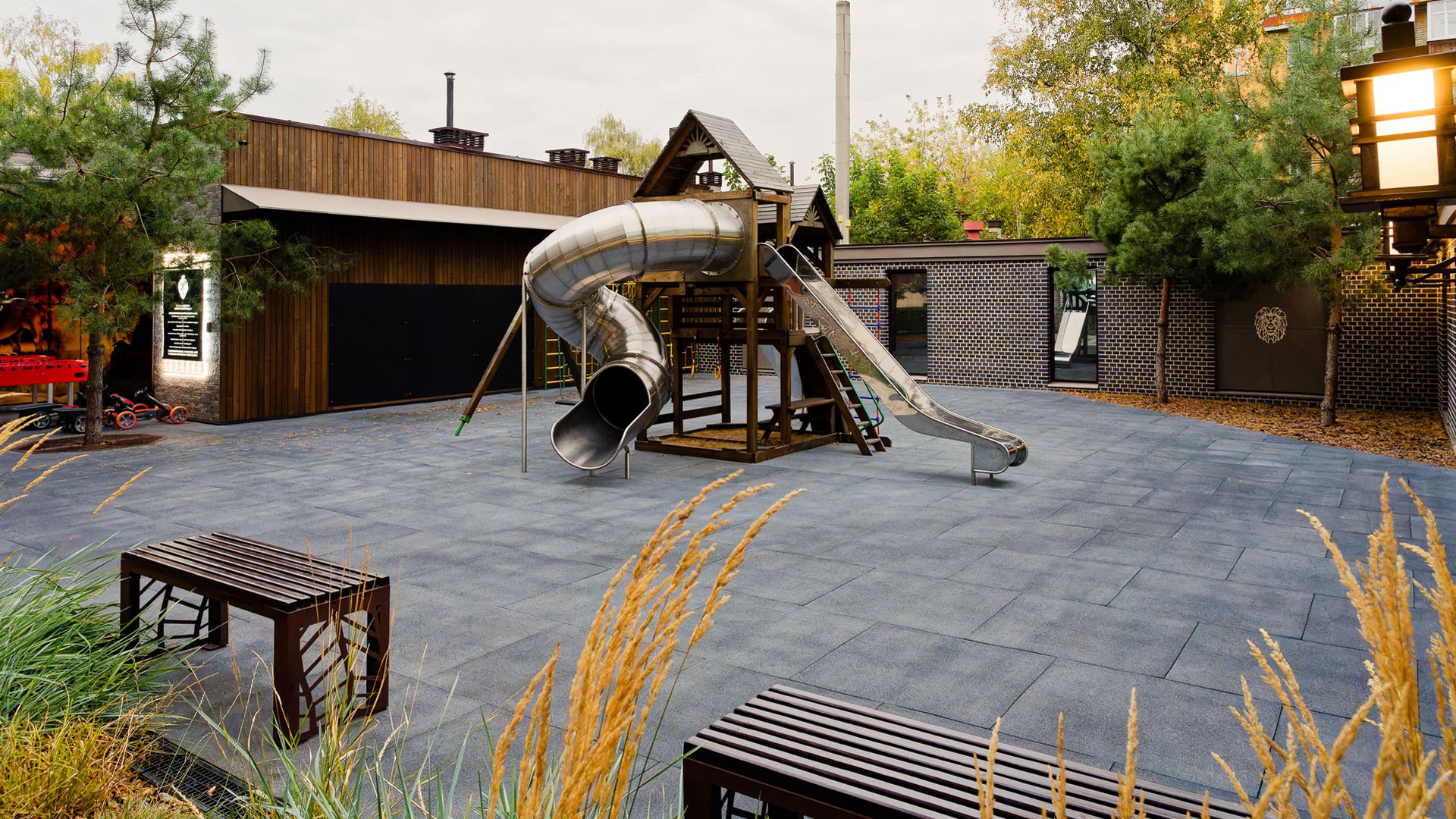 Во дворе установлен целый игровой комплекс, элементы которого рассчитаны на детей разного возраста: от малышей до подростков. Многофункциональная площадка разделена на тематические зоны. Наряду с привычными элементами также есть большой скалодром, шведская стенка, большая меловая доска.