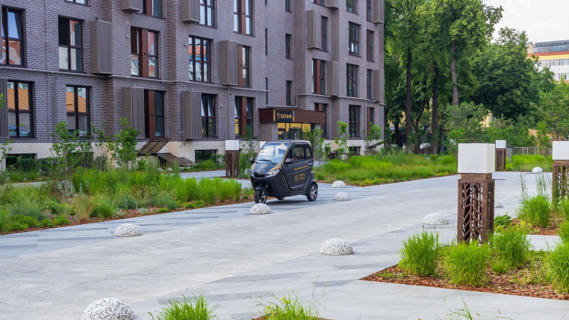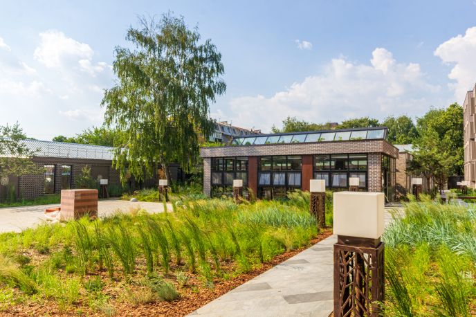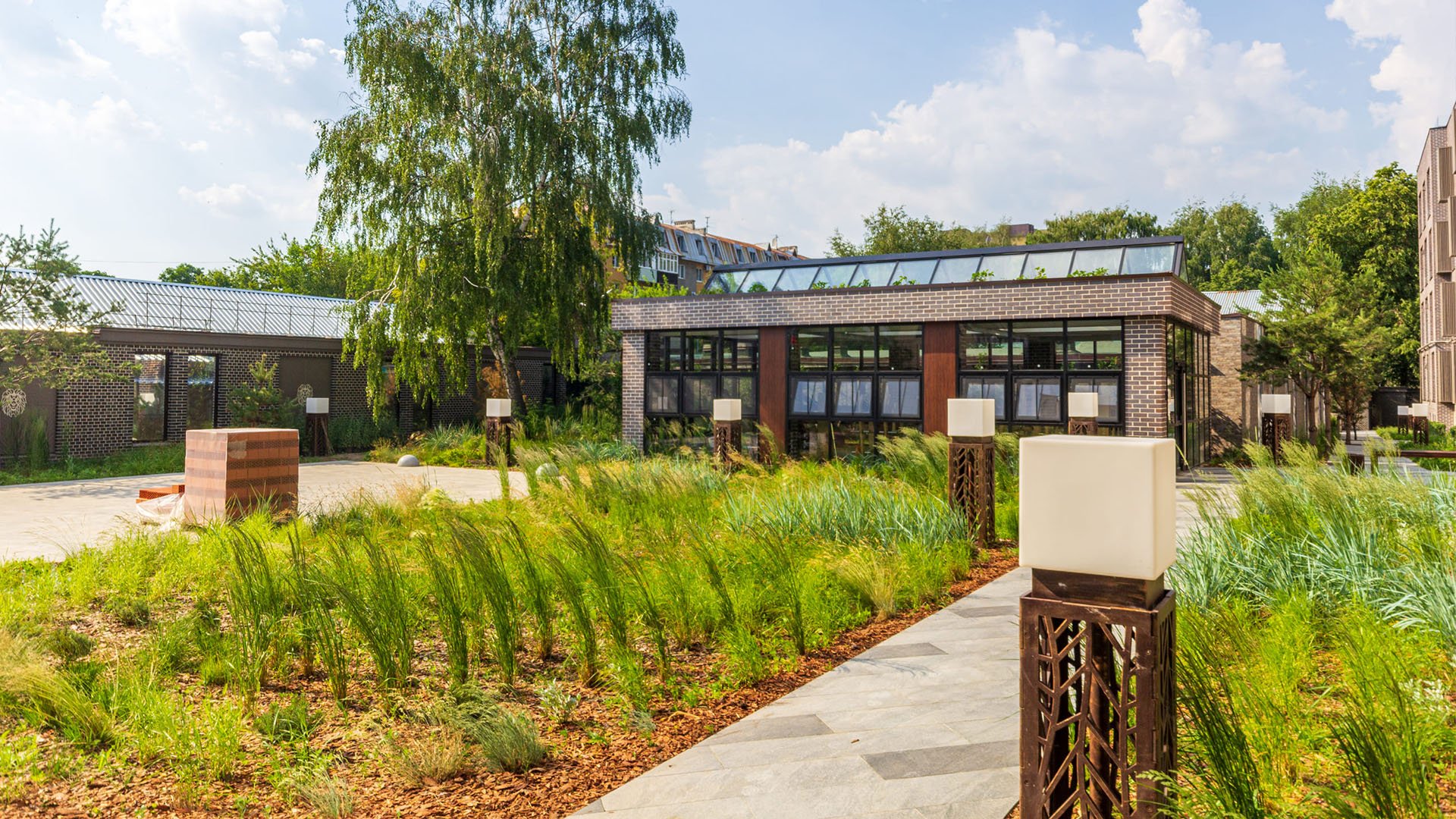 В обслуживании комплекса предусмотрено вторичное использование дождевых стоков. В специальной ёмкости накапливаются осадки, которые после фильтрации используются для капельного полива растений и уборки мест общего пользования.