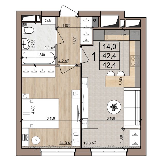 1 -комнатная 42.4 м2 Уточнить стоимость