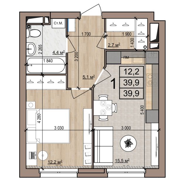 1 -комнатная 39.9 м2 Уточнить стоимость