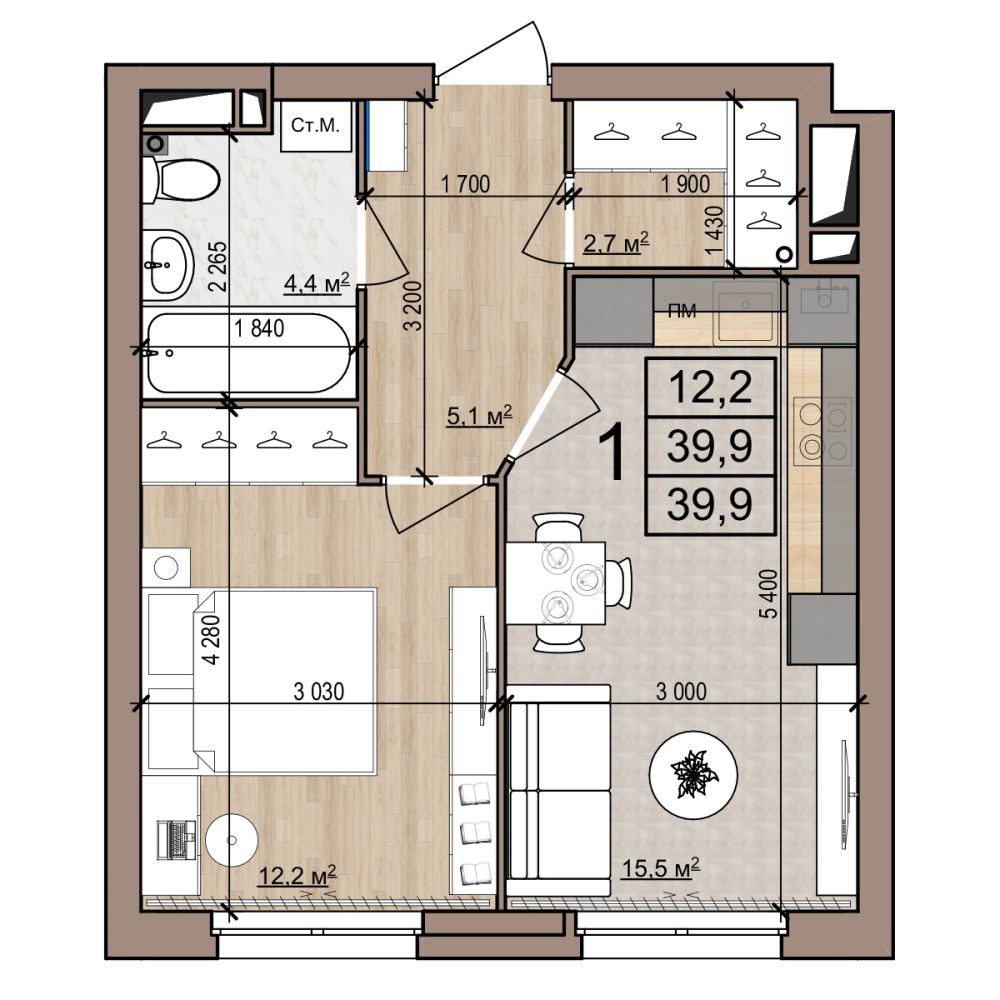1 -комнатная 39.9 м2 Уточнить стоимость
