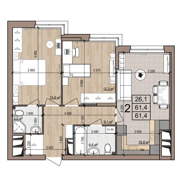 2 -комнатная 61.4 м2 Уточнить стоимость