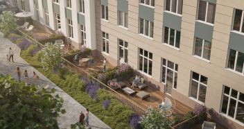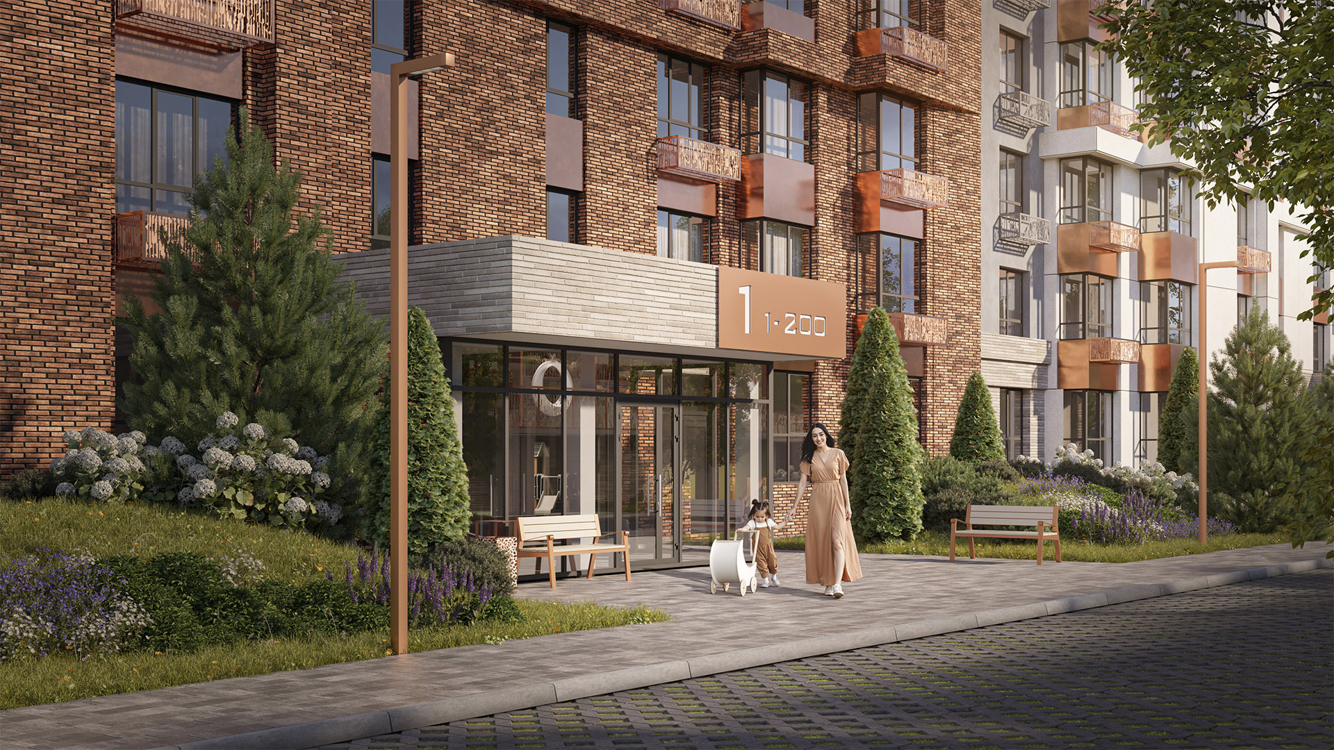 Особое внимание уделено благоустройству дворовой территории жилого комплекса: оно выполнено в двух уровнях. На верхнем расположена приватная зона с детскими и спортивными площадками, ландшафтным дизайном и декоративной подсветкой.