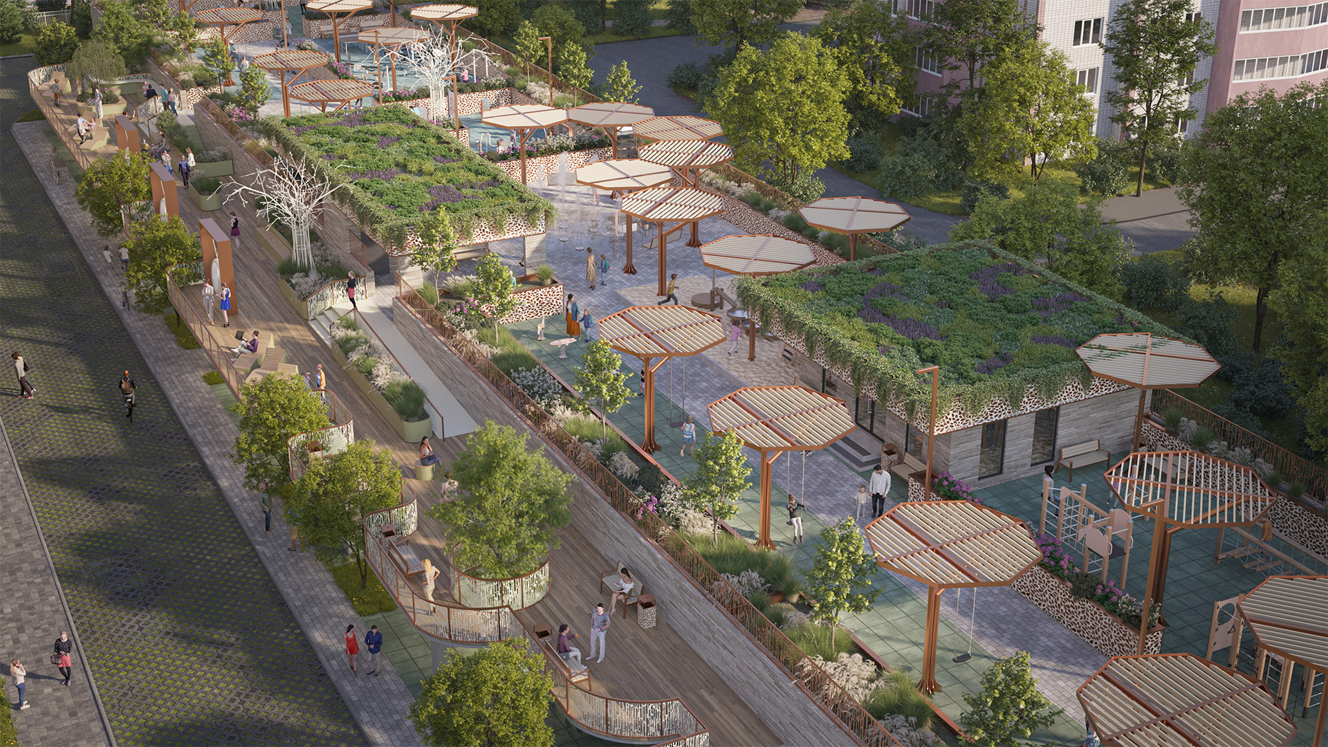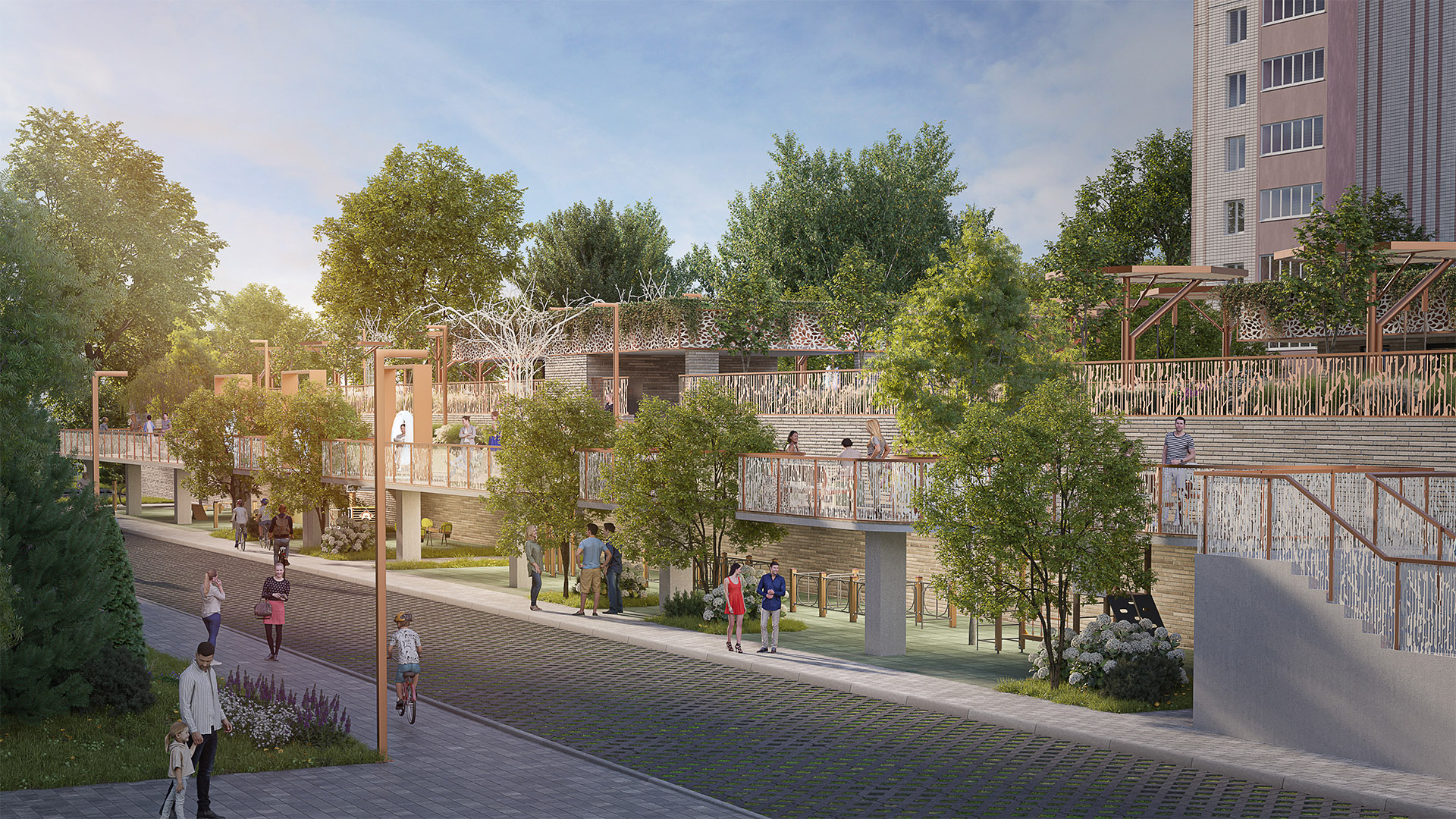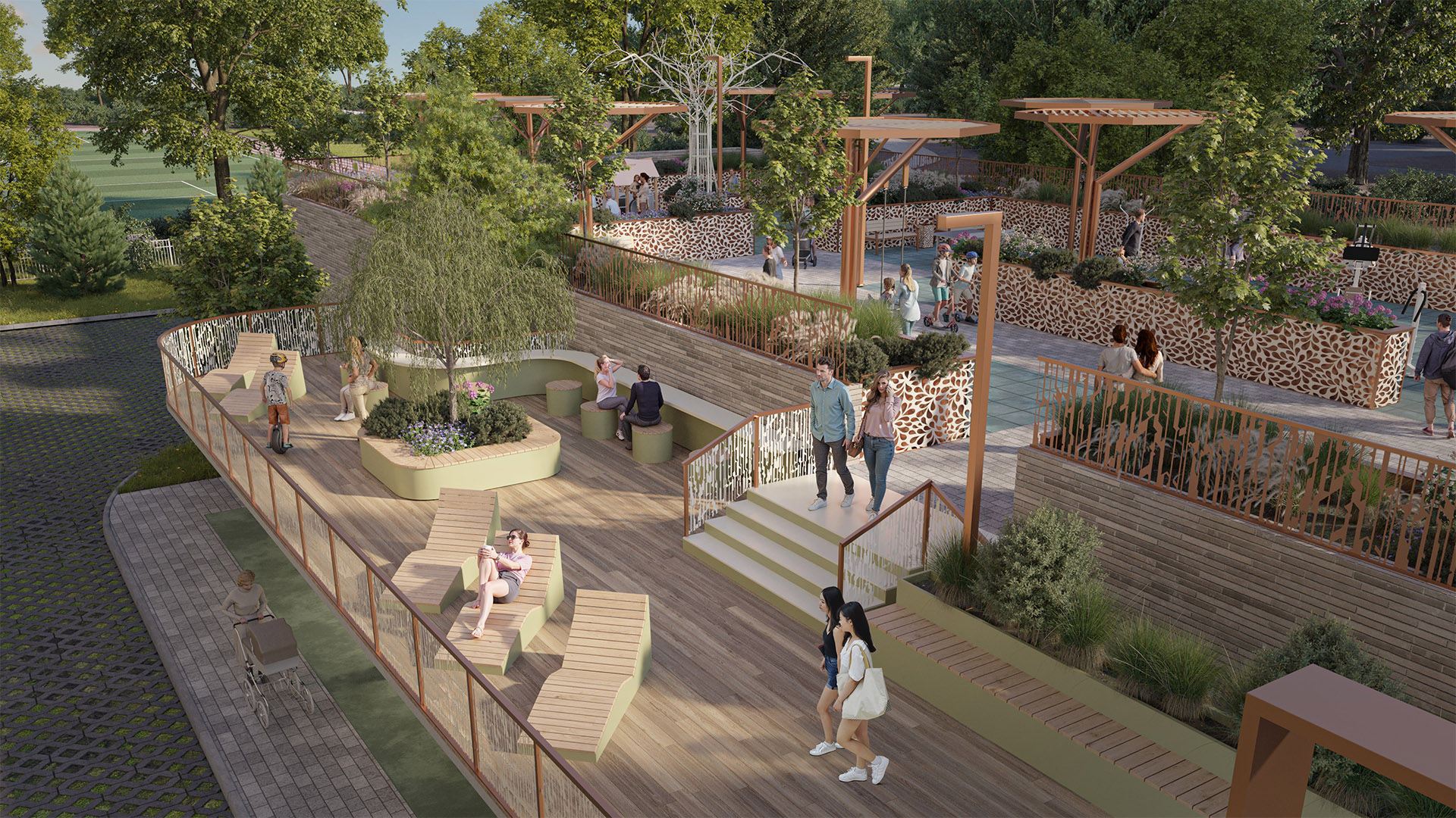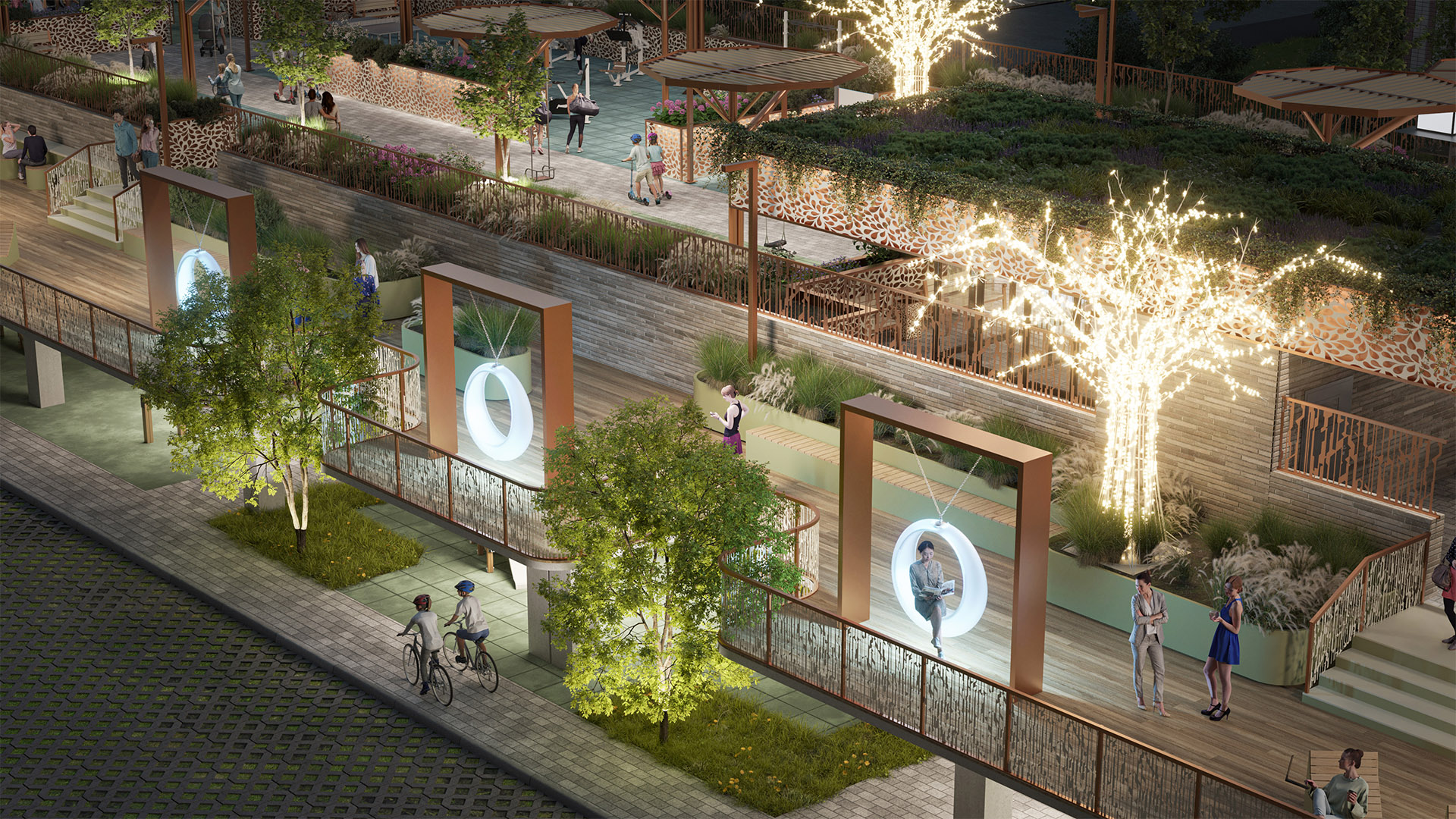 Нижний уровень - ещё одно пространство для прогулок и отдыха с уникальными архитектурными элементами, качелями, тренажёрами и местами для общения.