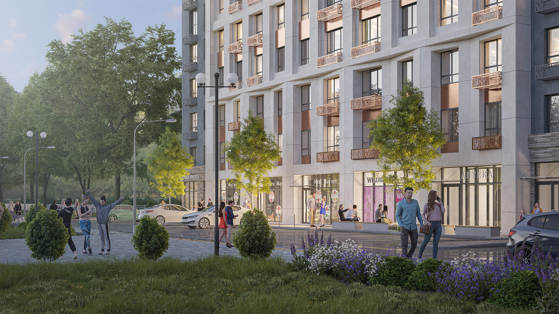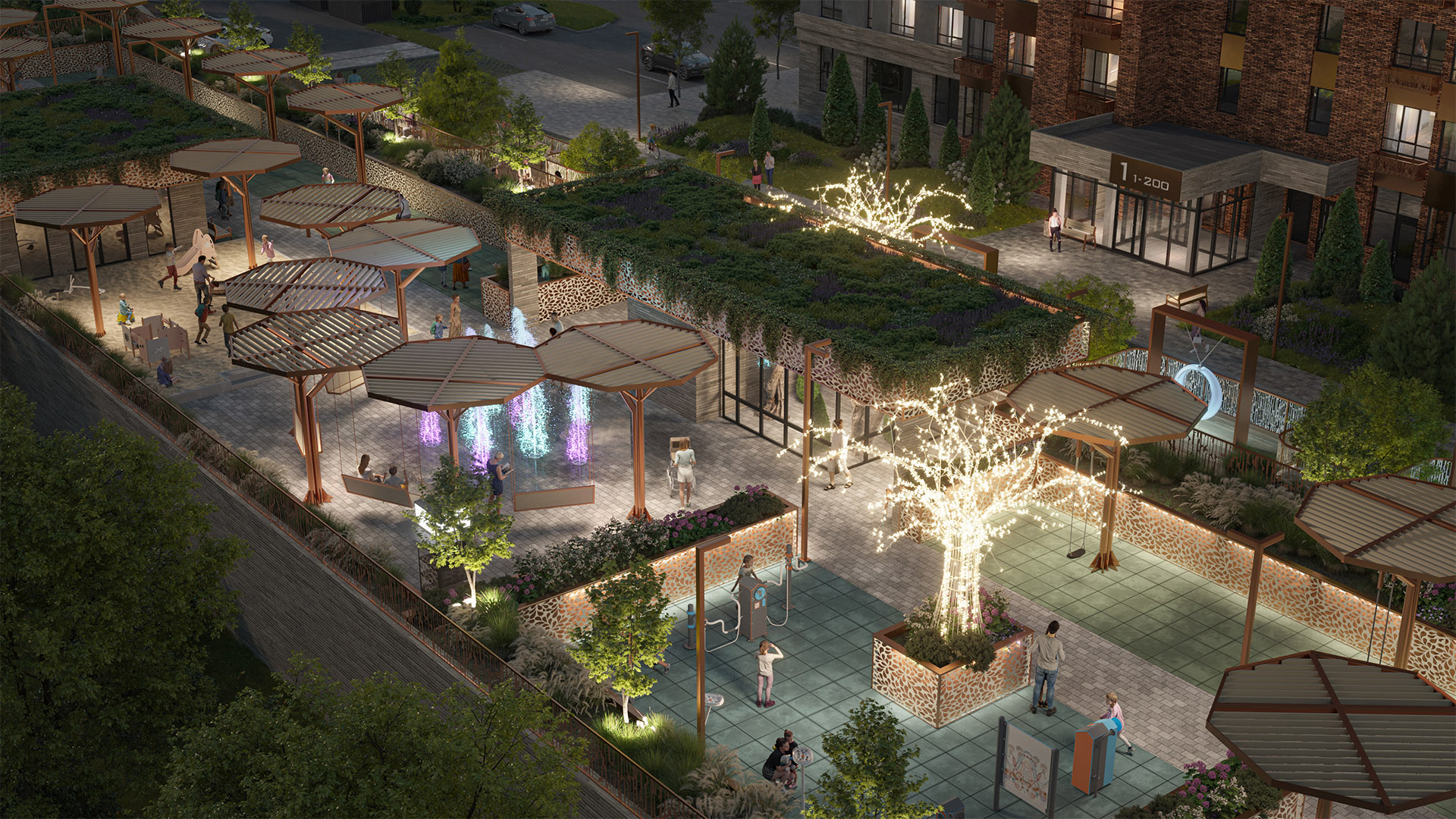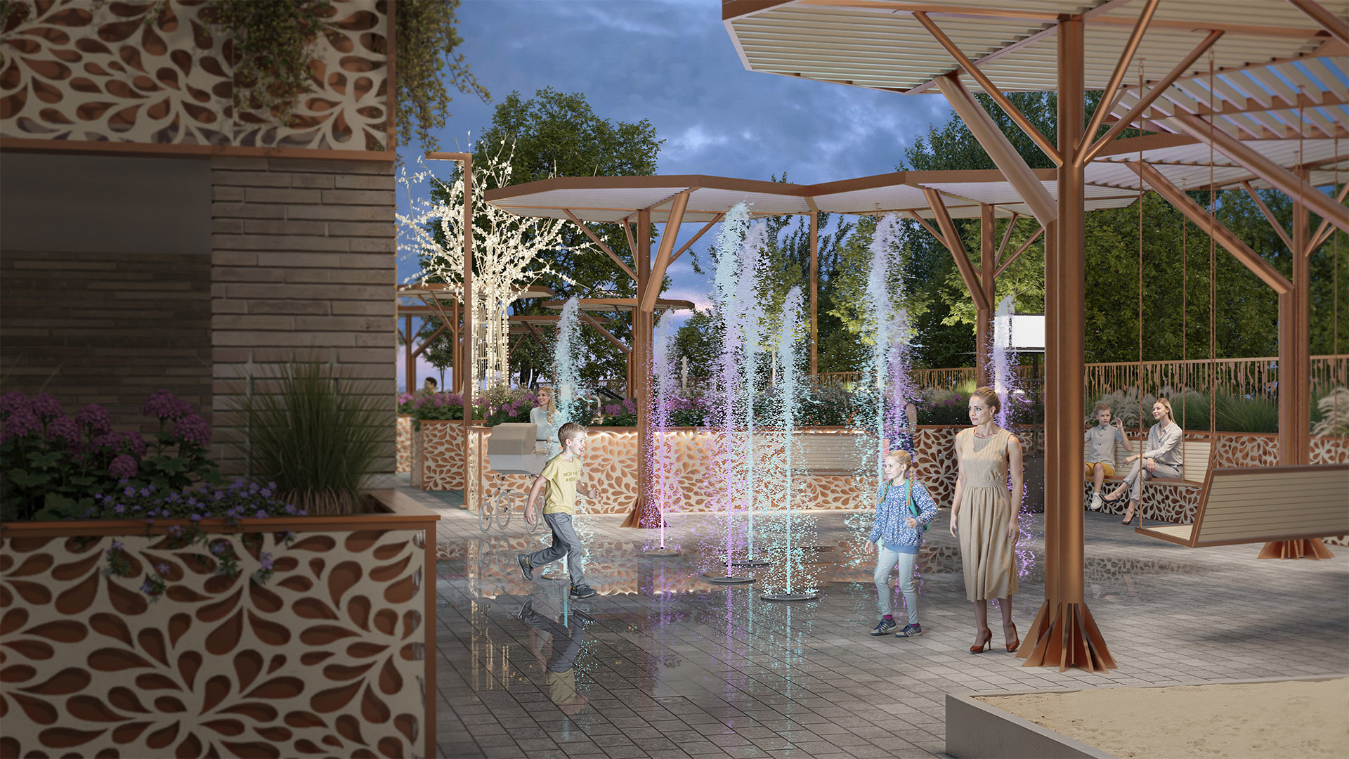 Взрослым в свою очередь понравятся спортивная площадка с уличными тренажёрами, «умные» скамейки с подогревом и USB-разъёмами, тихие зелёные зоны, беседки и нежные фонари с лунным светом - для самых романтичных свиданий.