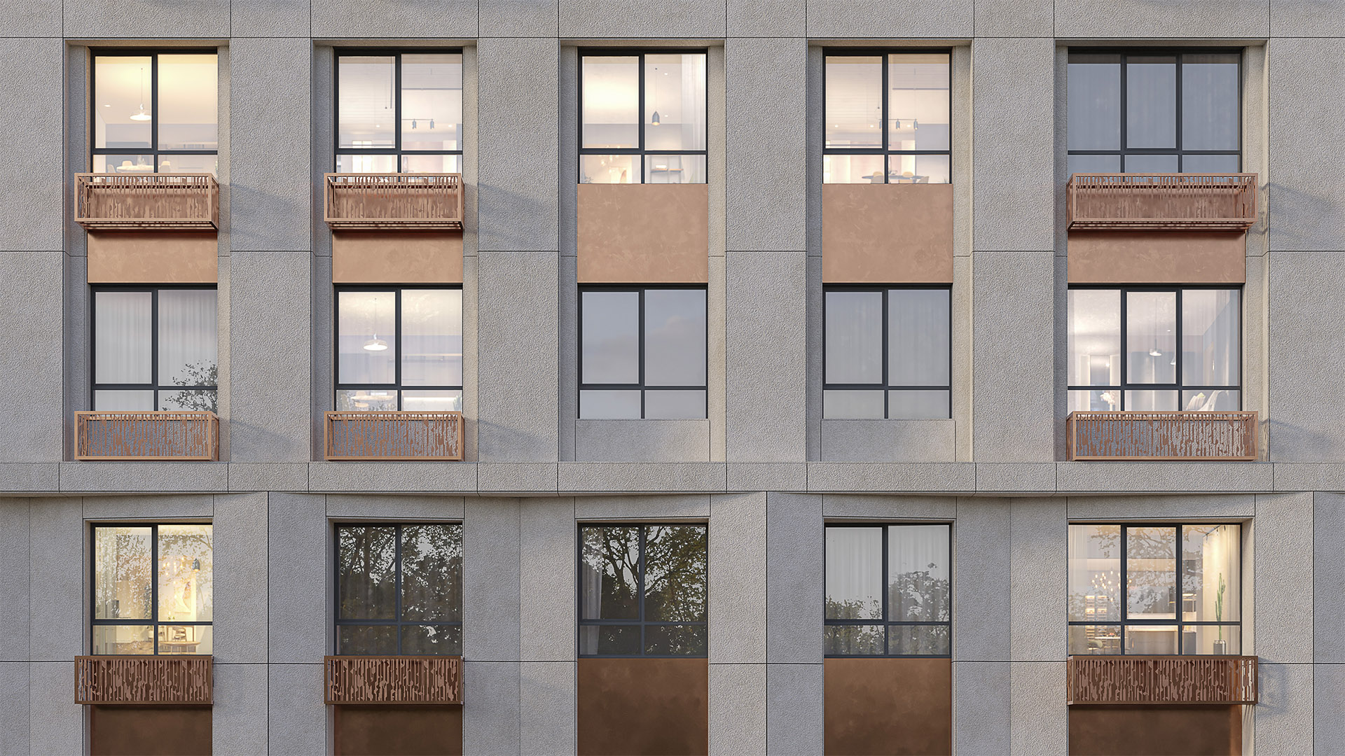 Фасад будет выполнен по системе вентилируемого фасада с утеплением и облицовкой керамогранитной плиткой. Для сохранения эстетики предусмотрены корзины под кондиционеры, которые не нарушают внешний облик дома.