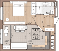 1 -комнатная 43.3 м2 4 969 300 ₽