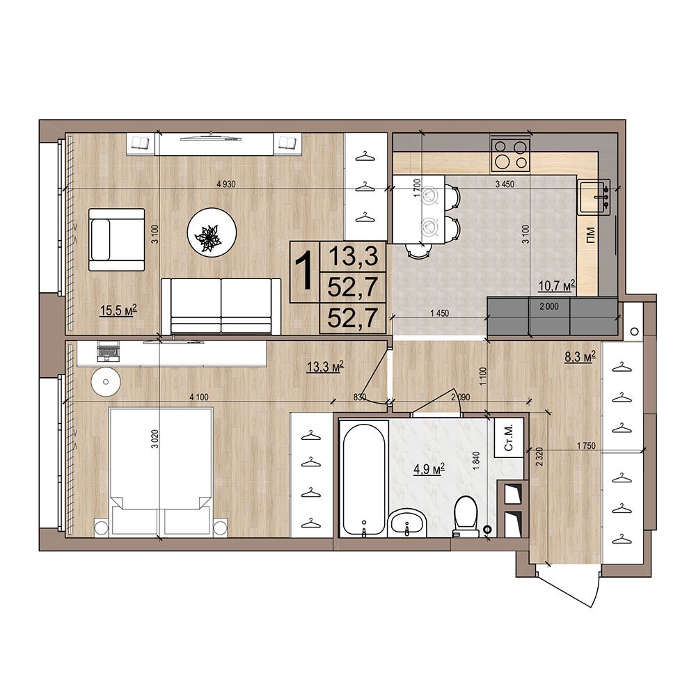1 -комнатная 52.5 м2 Уточнить стоимость