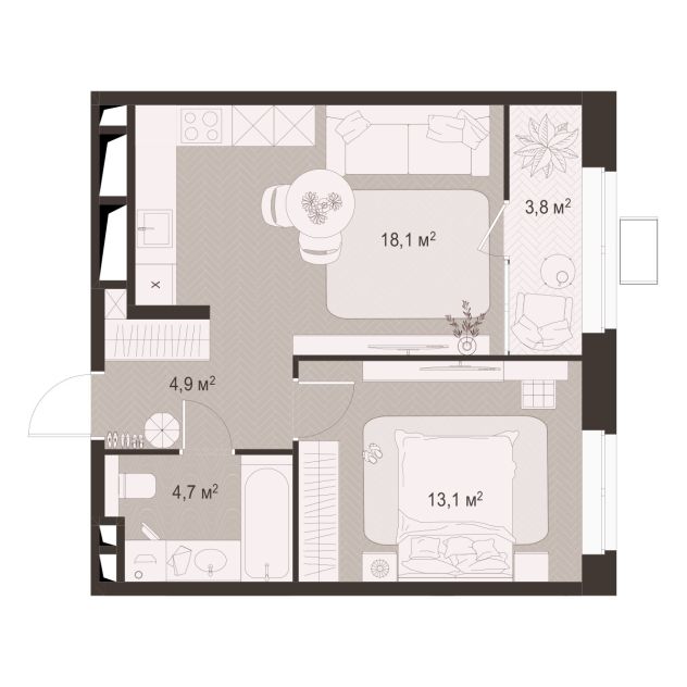 1 -комнатная 42.8 м2 Уточнить стоимость