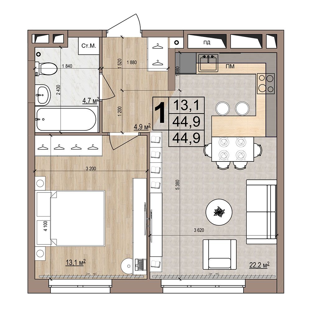 1 -комнатная 44.9 м2 Уточнить стоимость