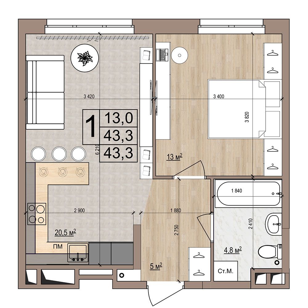 1 -комнатная 43.3 м2 Уточнить стоимость