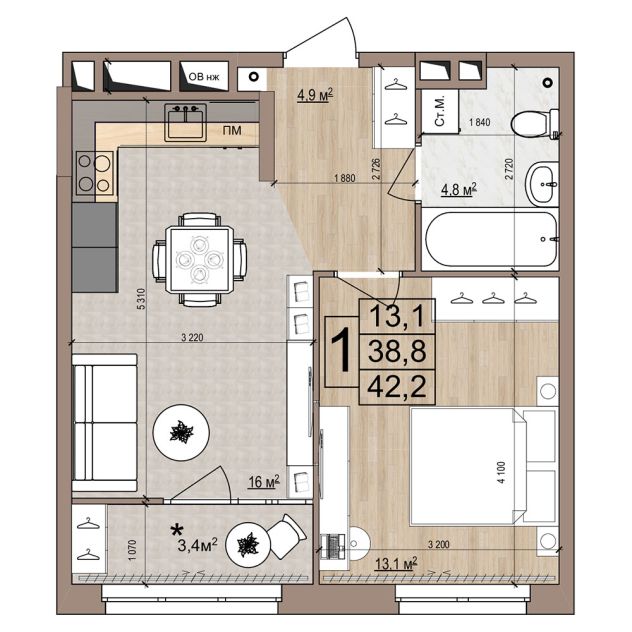 1 -комнатная 41.1 м2 Уточнить стоимость