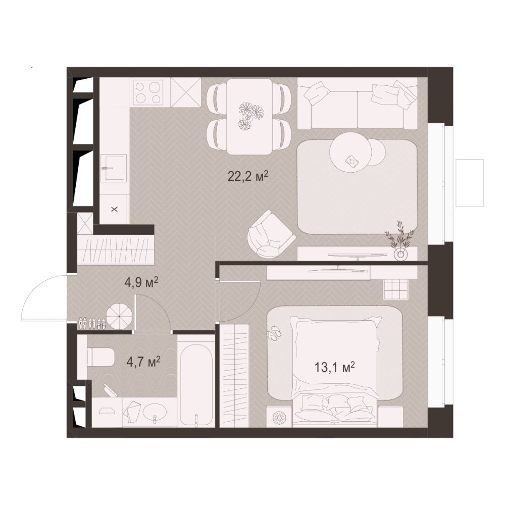 1 -комнатная 42.8 м2 Уточнить стоимость