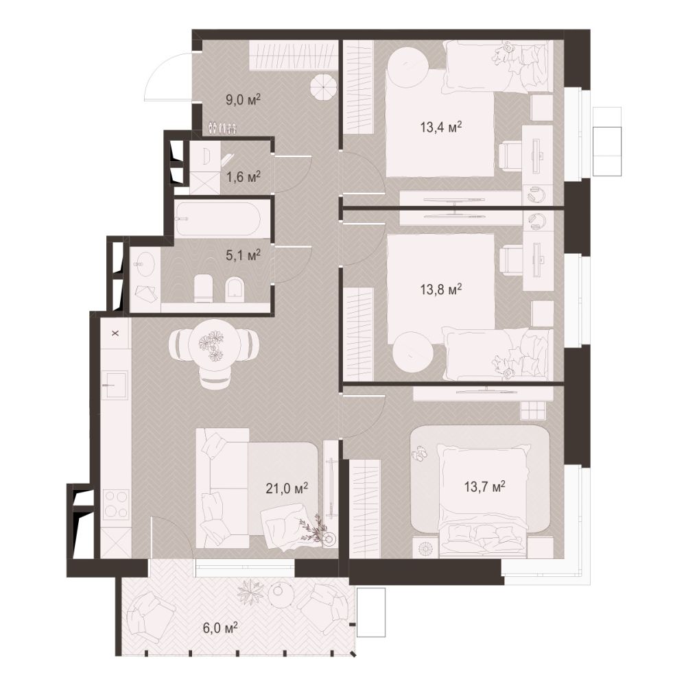 3 -комнатная 83.6 м2 Уточнить стоимость