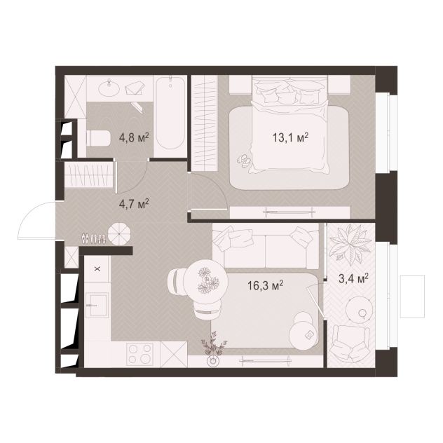 1 -комнатная 43.7 м2 Уточнить стоимость