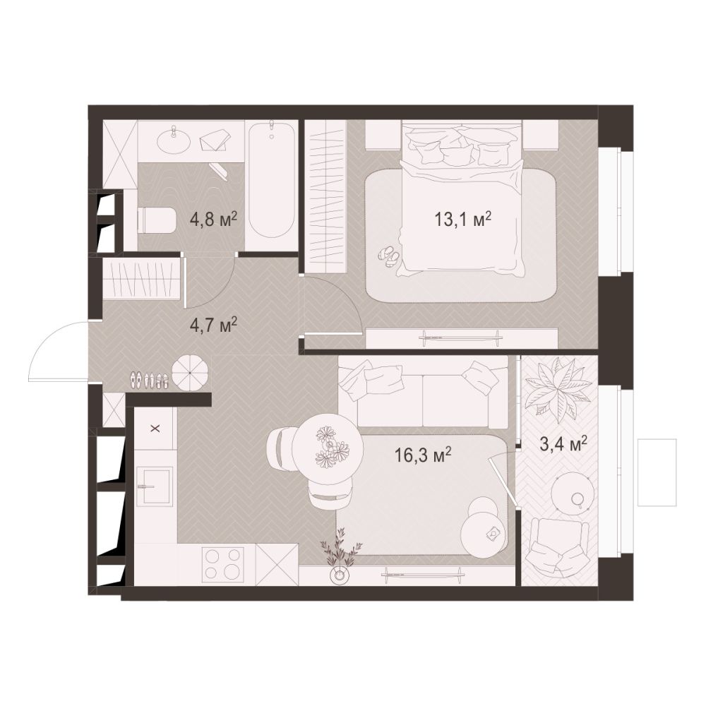 1 -комнатная 43.1 м2 Уточнить стоимость