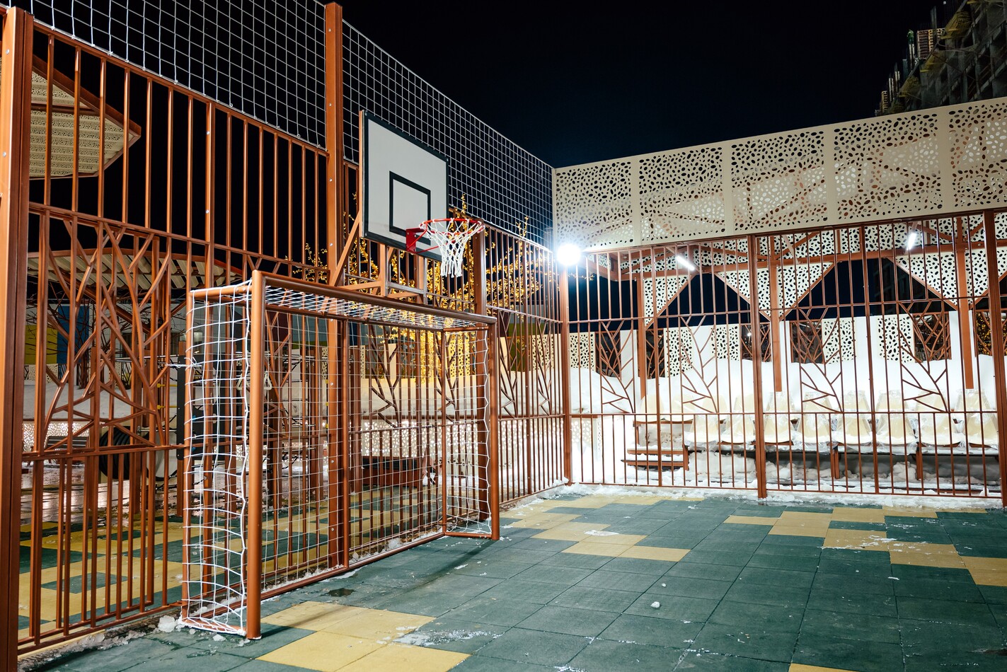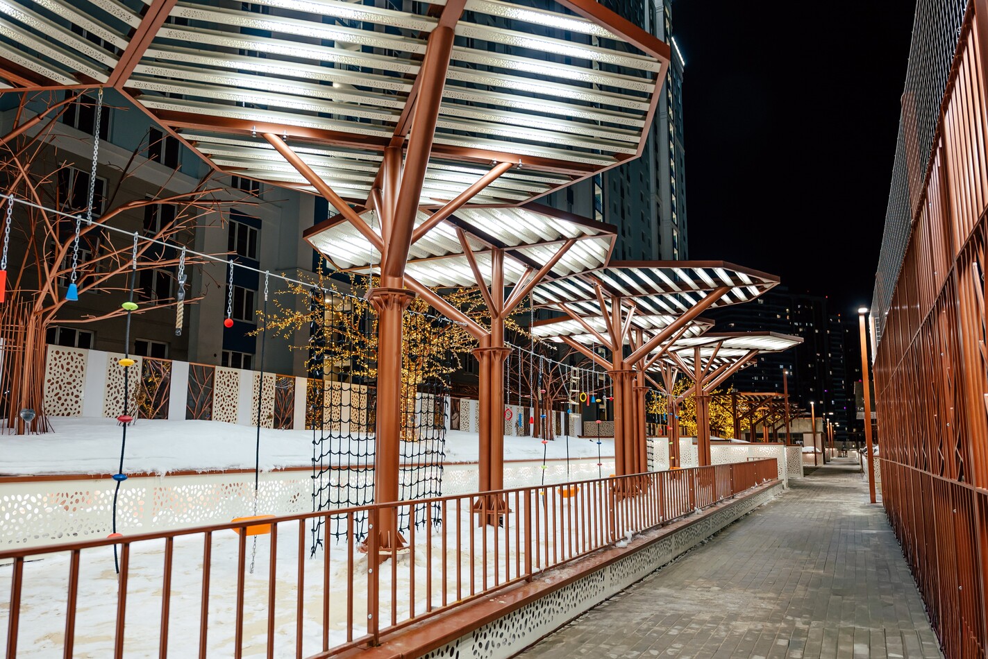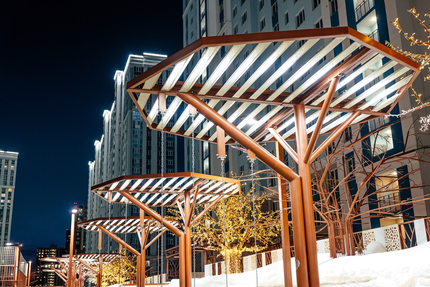 - Скамейки, фонари, а также световые деревья и навесы у нас собственного производства, - подчеркнул Сергей Котусов. - Причём в этом доме мы впервые смонтировали RGB-подсветку, которая будет радовать жильцов, создавать им настроение, а также подстраиваться под движение струй фонтана (он заработает в тёплое время года). Всё будет очень красиво!